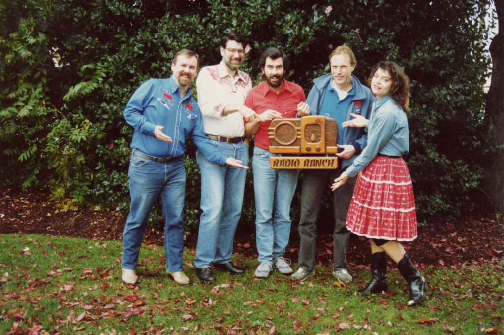 The photo of Paul, Jim, and me with Rob McGregor and Gwendolyn Reischman features a carving we had commissioned as a thank you to Paul for allowing us to use his place, which we’d dubbed “Radio Ranch.” The five of us posed because we each produced/hosted one Co-op Radio show each month on, you guessed it, “Radio Ranch.”